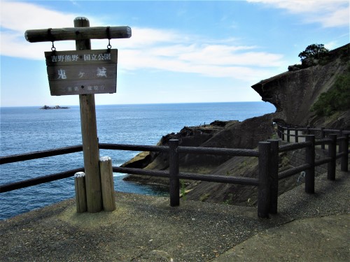 楯ケ崎は、高さ70m・周囲600mの大岸壁で、まっすぐな無数の柱が連なったように見える「柱状節理」と呼ばれる地形が特徴です。周辺には奇岩・巨石や貴重な植物体系が多くみられることから、吉野熊野国立公園・特別保護地区に指定されています。日本書紀などに記された神武天皇東征の際には、この付近に上陸したと考えられており、千畳敷には記念碑が建てられています。(但し、伊勢湾台風で流失)楯ケ崎の裏手には高さ170mを誇る「海金剛」があり、ここは海上遊覧船からしか見ることができない大迫力の見事な絶壁です。船で見に行くのが一番ですが、二木島駅から5㎞歩くと到着します。小学校5年の遠足コースでした。遊覧船有り(3000円~)